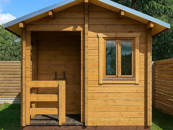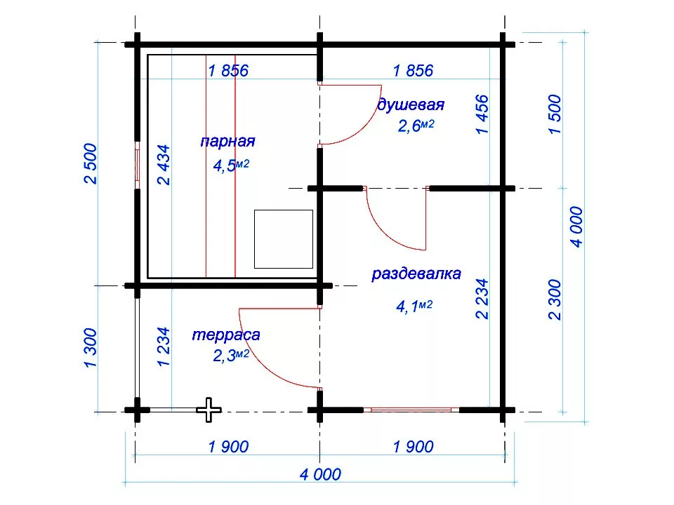 Конструкция этого проекта бани предполагает все необходимое для идеального расслабления. Просторная парная (4,1м²), небольшая душевая (2,3м²), вместительная комната отдыха (4,5м²) и уютная открытая веранда (2,7м²) - здесь все органично и продумано.
