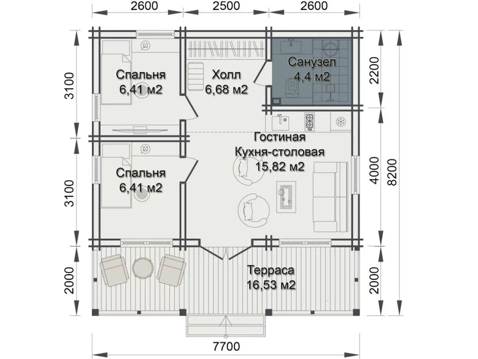 С огромной террасы (15,31м²) сквозь широкие двери вместе с солнцем мы попадем сразу в просторную гостиную (22,28м²), размеры которой при необходимости позволят дополнить ее тамбуром. Но наш вариант – скорее летний, гостевой, рассчитанный, что большая часть дня пройдет на свежем воздухе, за пределами дома.