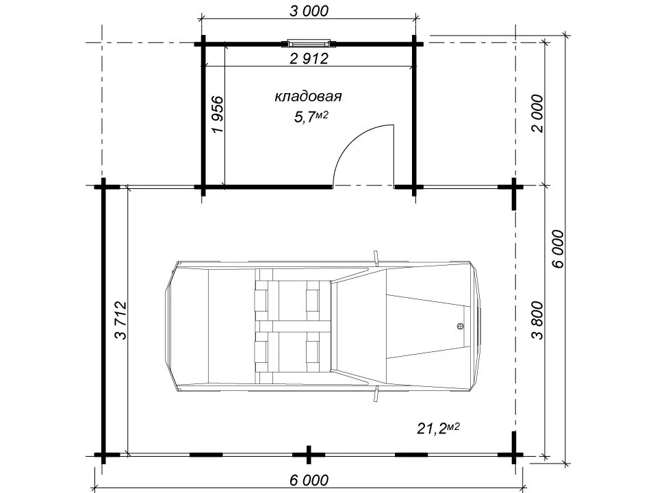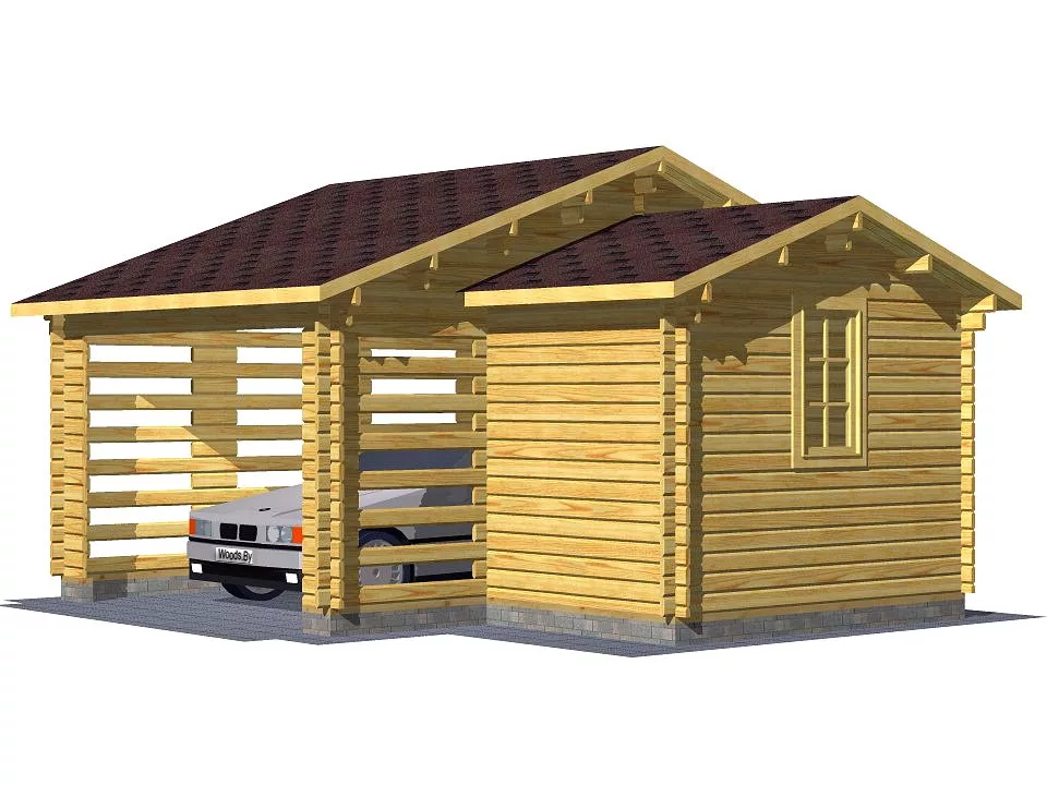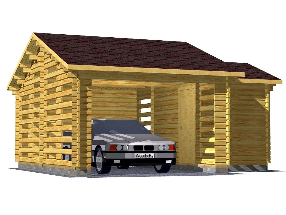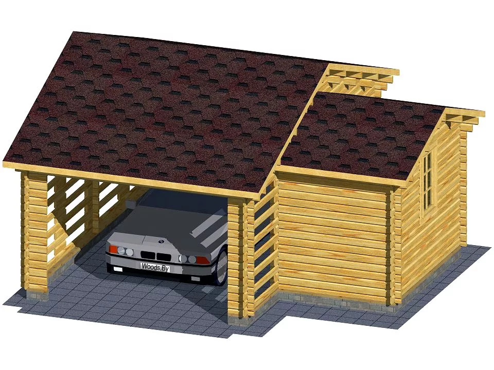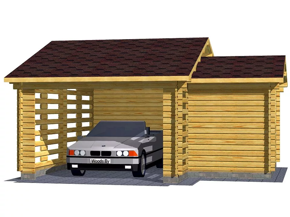 Проект гаража с хозблоком предельно прост. Это стандартный навес для автомобиля, боковые стены которого сделаны вентилируемыми, плюс дополнительное помещение площадью почти в 5 кв.м., соединенное с одной из стен. Кстати, расположение кладовки может быть любое по желанию заказчика, справа или слева от въезда.
