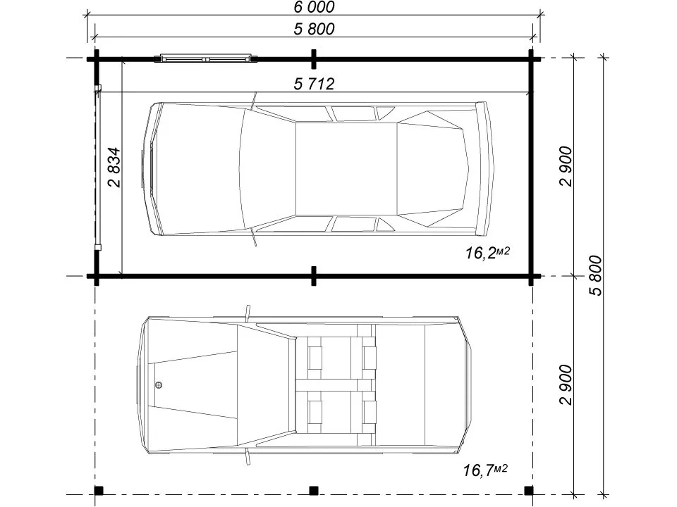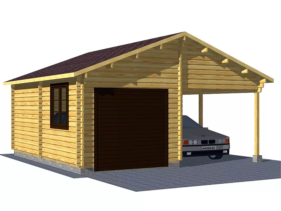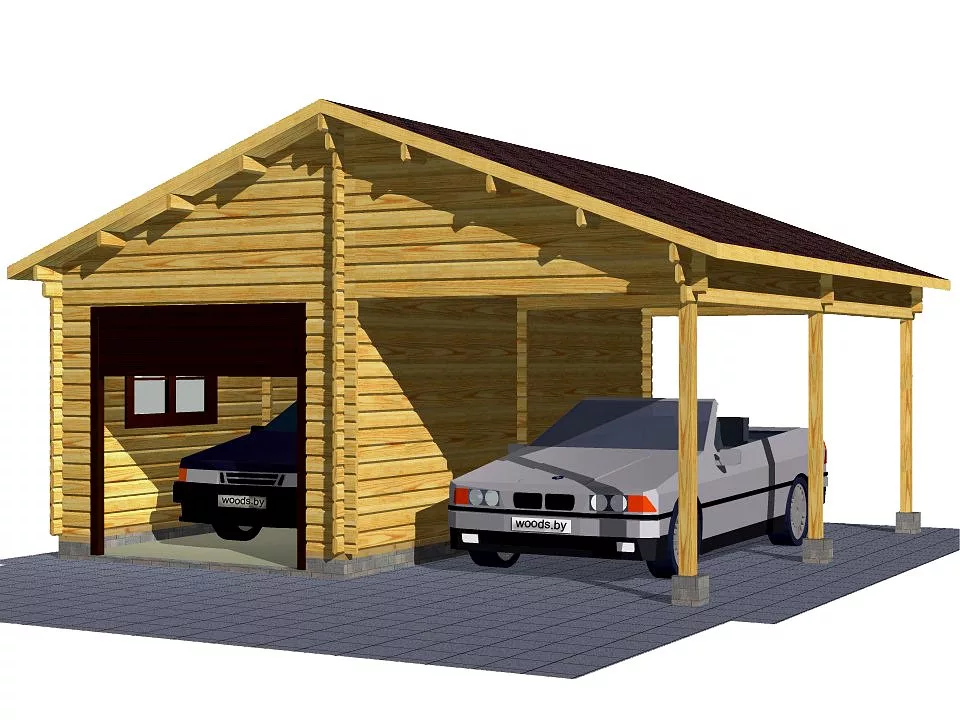 В составе новой конструкции из бруса от компании ВираБуд – два равно размерных помещения (по 17м²), предназначенных для хранения автомобилей, одно – полностью закрытое, а другая площадка, наоборот, максимально открытая и проветриваемая.