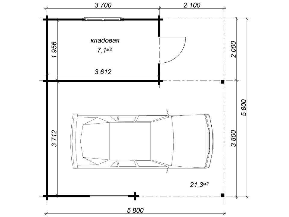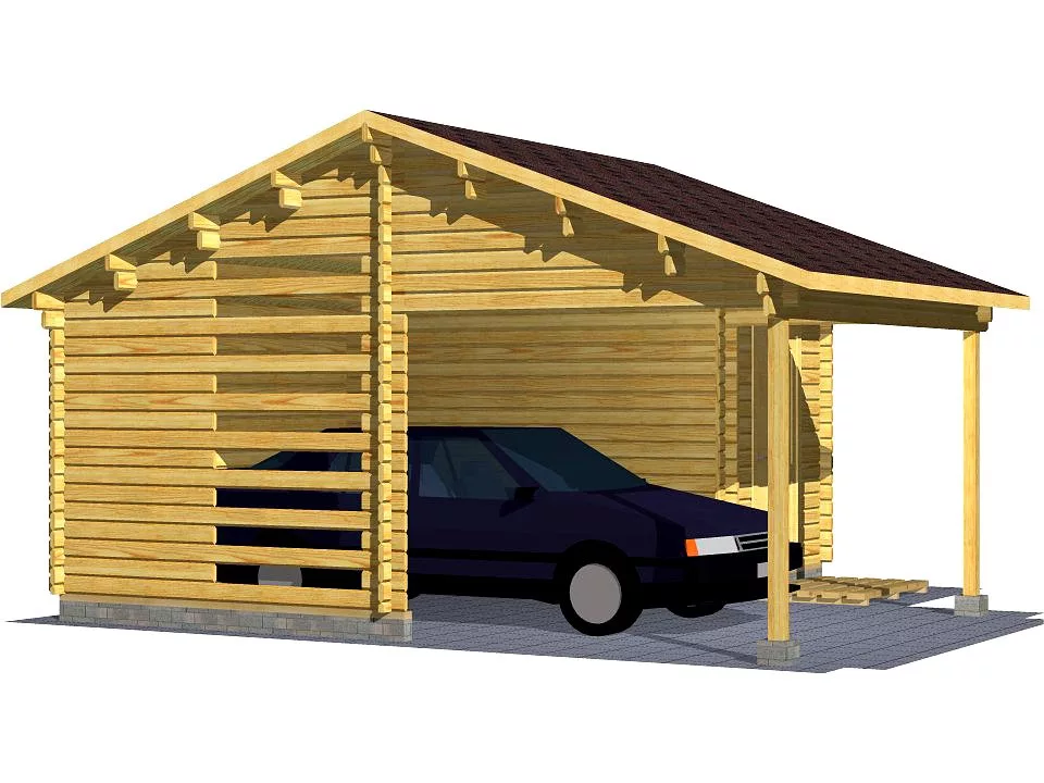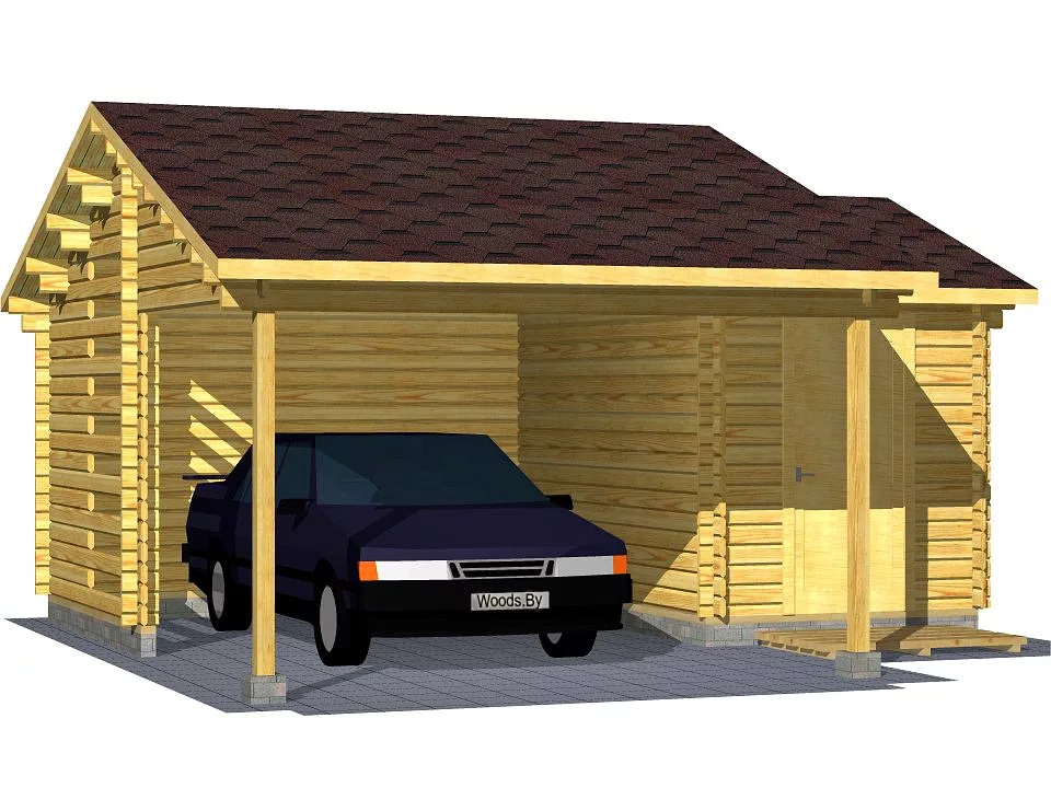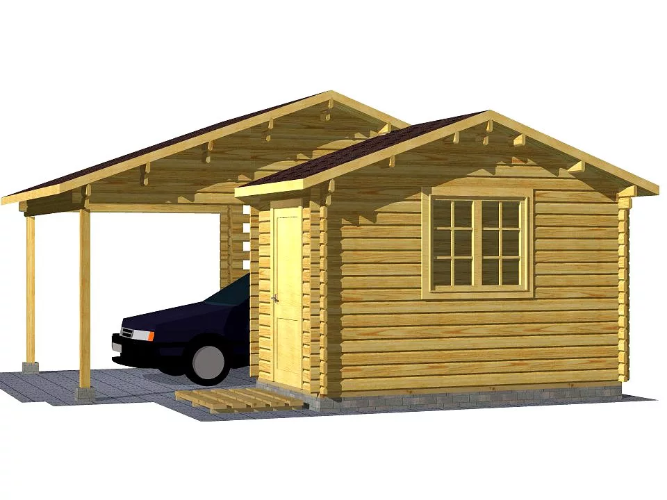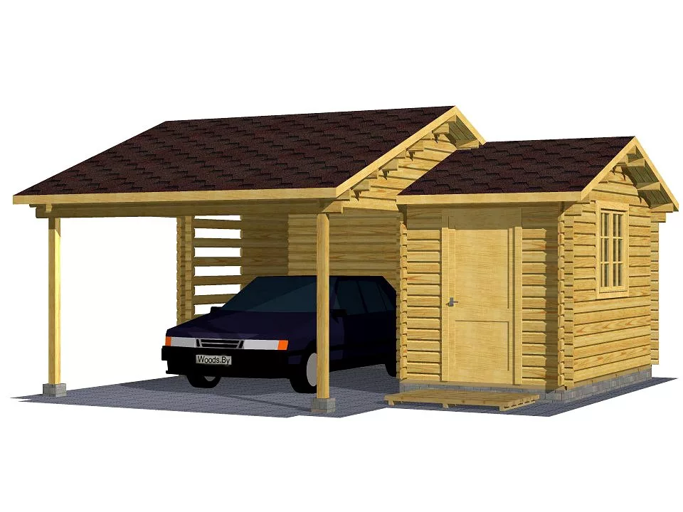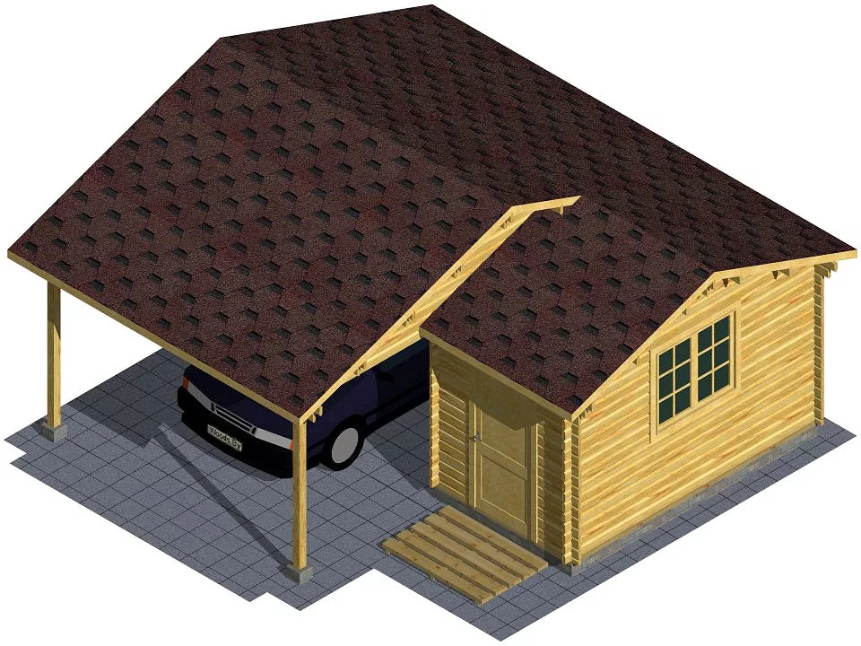 Симбиоз легкого вентилируемого навеса для автомобиля и закрытого помещения площадью 5,0м², пристроенного с правой стороны (при желании может быть слева). Мастерская оборудована отдельным входом и застекленным окном. Также при желании можно сделать выход в сторону автомобиля.