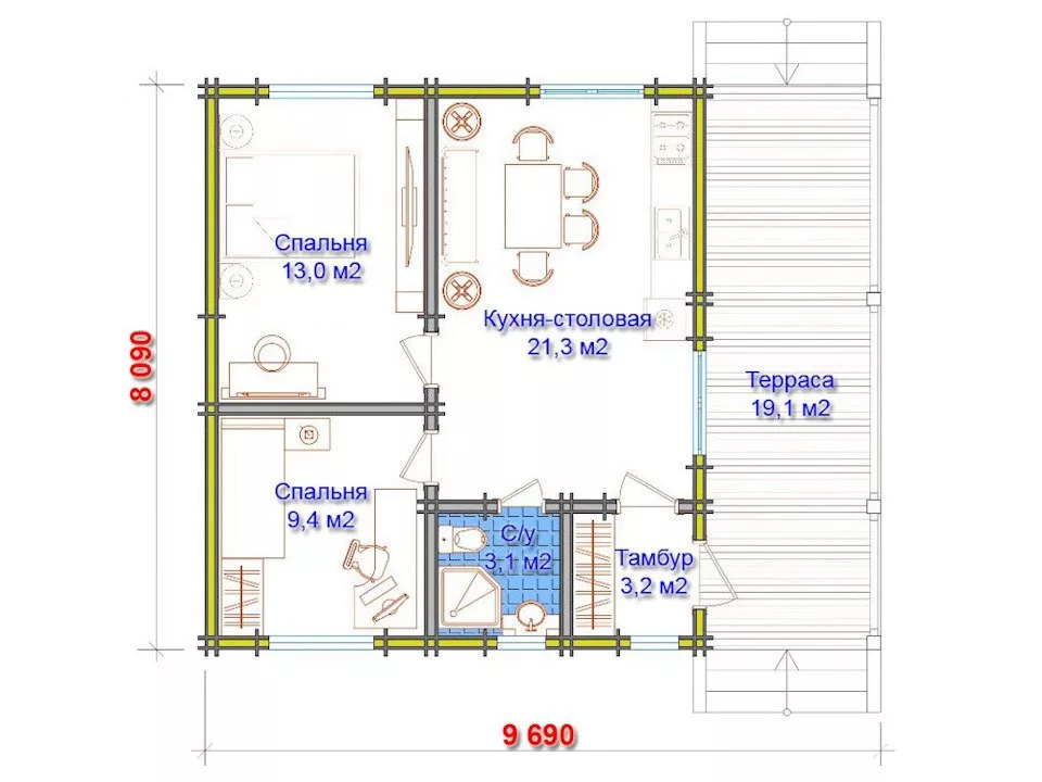 Конструкция стены по технологии "двойной" брус с заполнением пространства высокоэффективным теплоизоляционным материалом "Эковата" толщиной 150 мм. Брус камерной сушки из хвойных пород дерева влажностью 10-12% монтируется по технологии четырехстороннего замкового паза с ветровым замком (теплый не продуваемый угол)