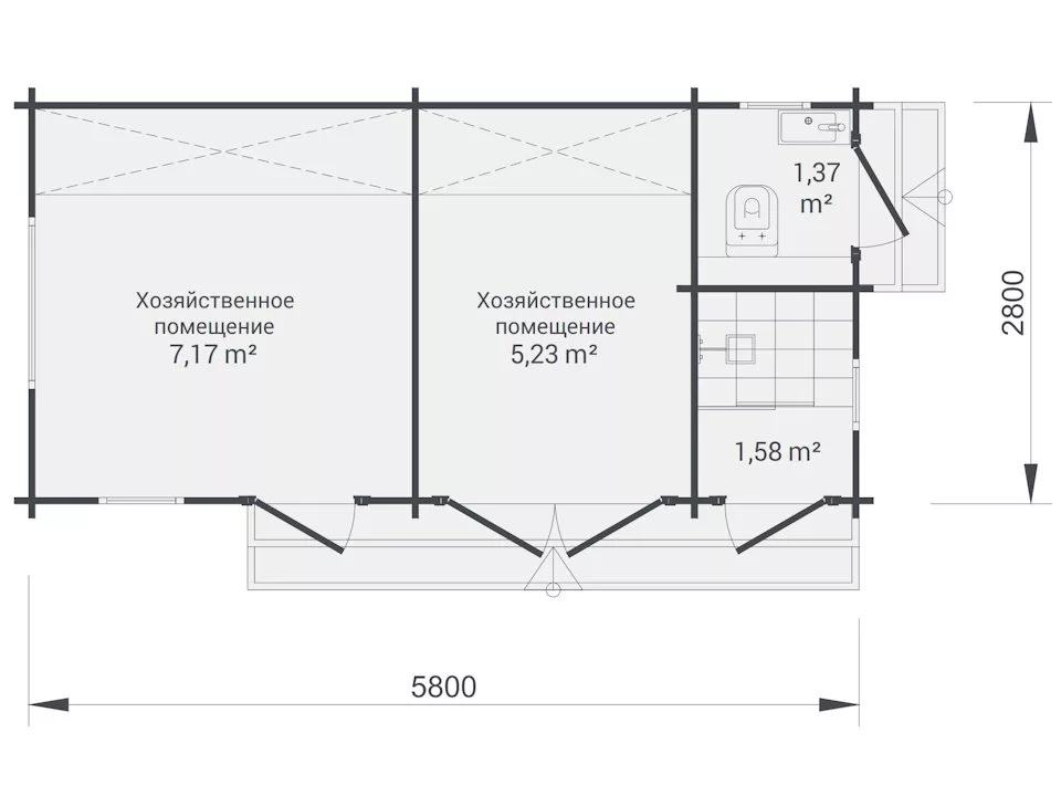 Хозблок 6х3 включает в себя четыре помещения. Большая комната (7,1м²) хороша как для отдыха, так и как плацдарм для созидательного труда, позволяющий вместить различное бытовое оборудование. Соседняя комната (5,3м²), с двойными дверями, подойдет для кухни, но станет еще более выигрышным вариантом для создания хранилища садового инвентаря или материалов.
