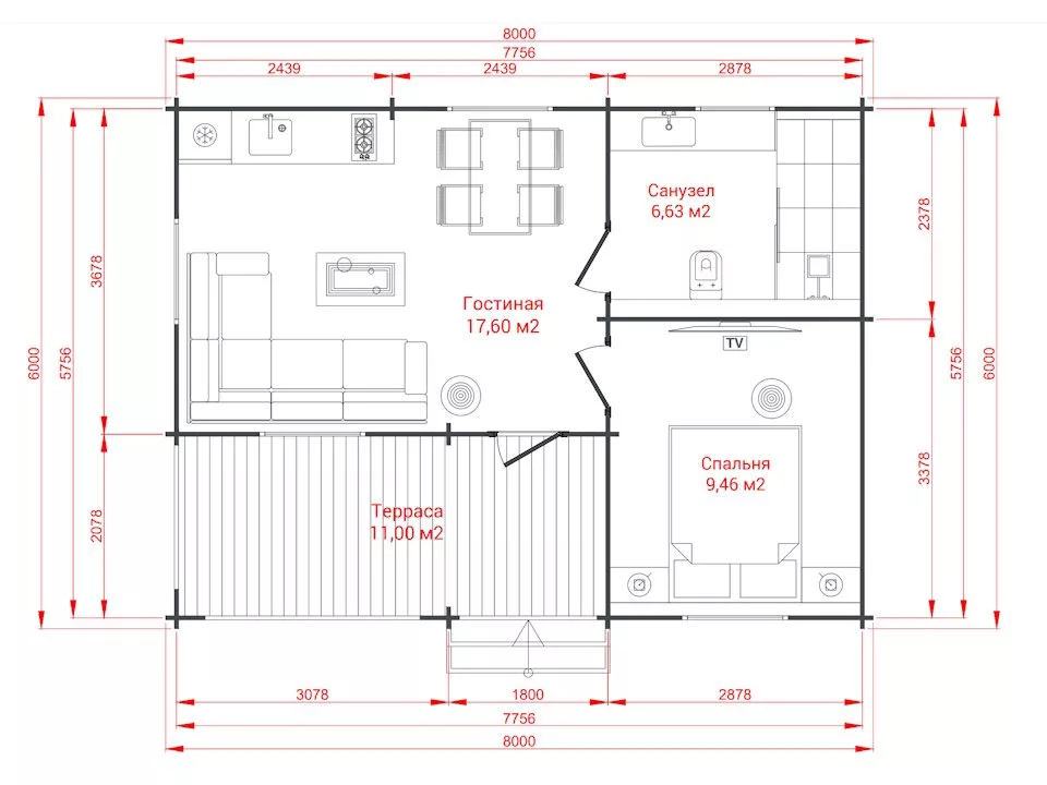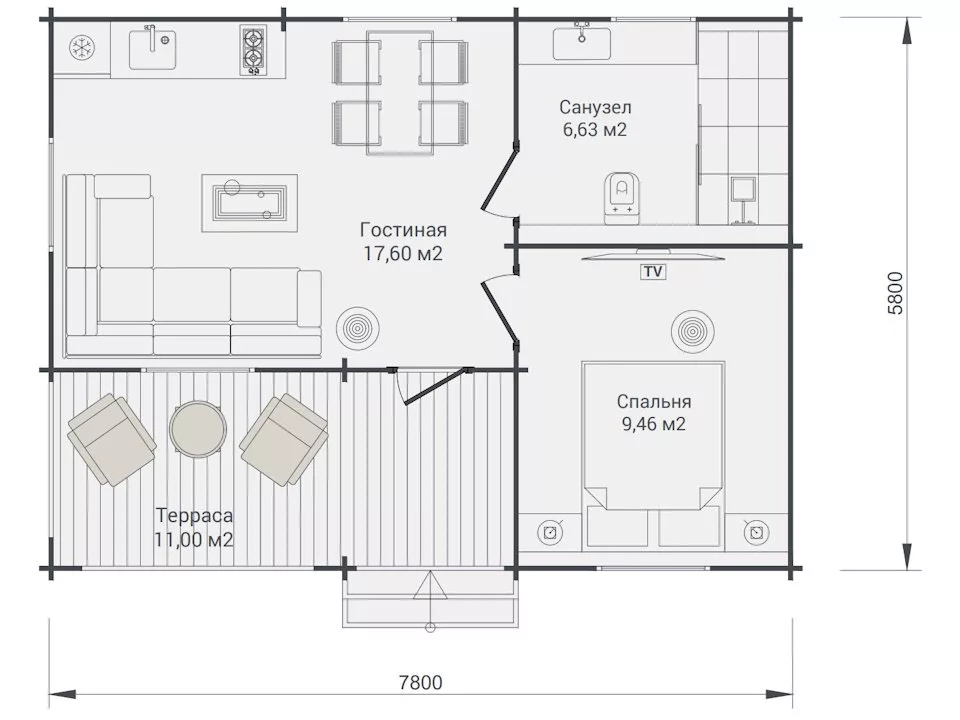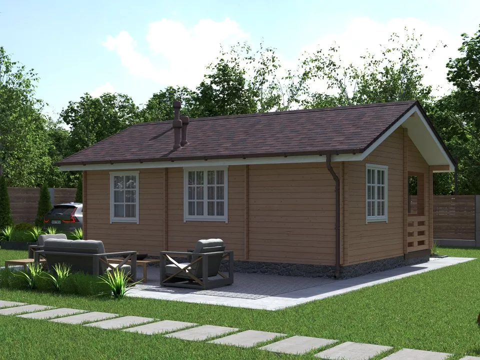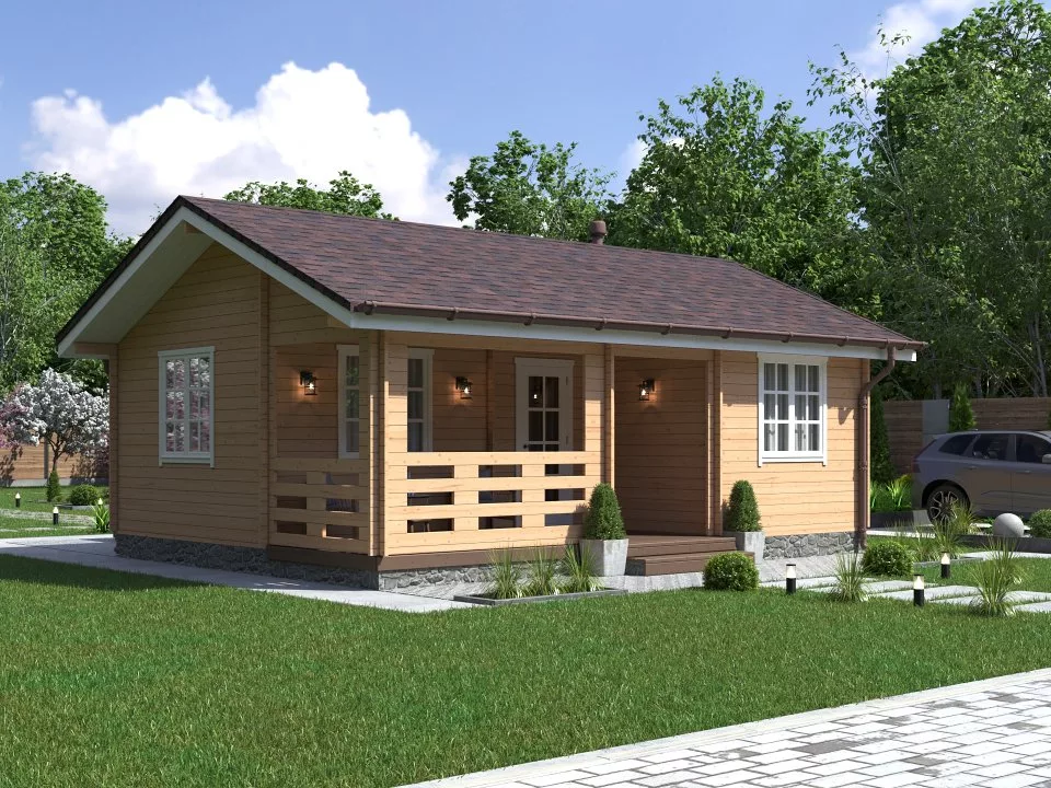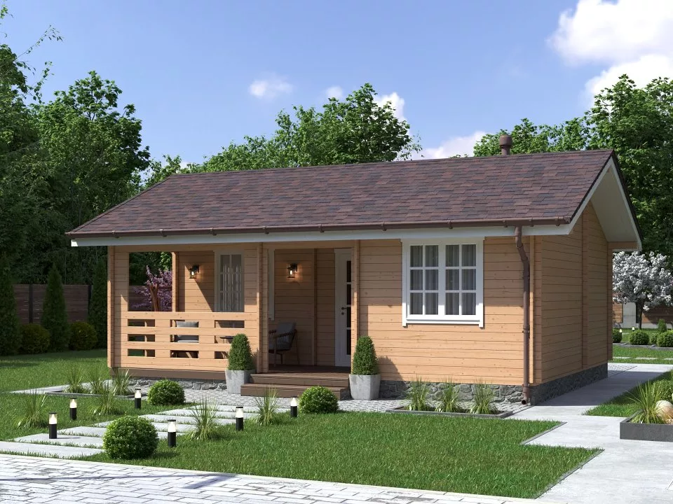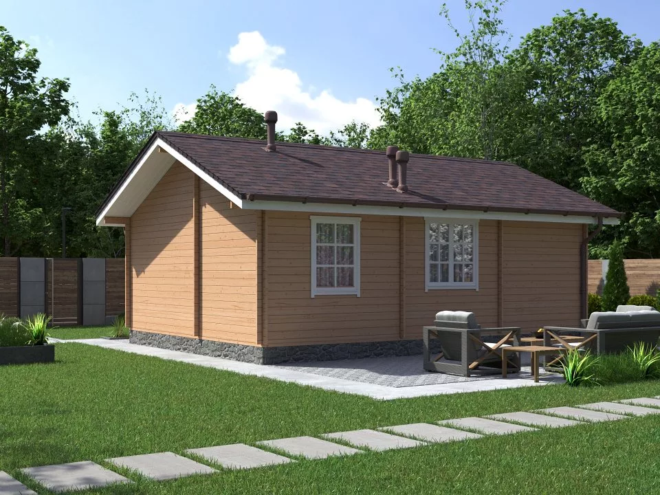Планировка дома включает три помещения площадью 17,4, 6,5 и 9,3 кв. м, в которых можно обустроить гостиную, спальни, детскую комнату и другие функциональные зоны. Особенностью строения является просторная веранда для отдыха на свежем воздухе. Этот проект уже был реализован и отлично зарекомендовал себя в эксплуатации, но если возникнет необходимость внести в типовые чертежи какие-либо изменения, наши специалисты всегда пойдут навстречу вашим пожеланиям.