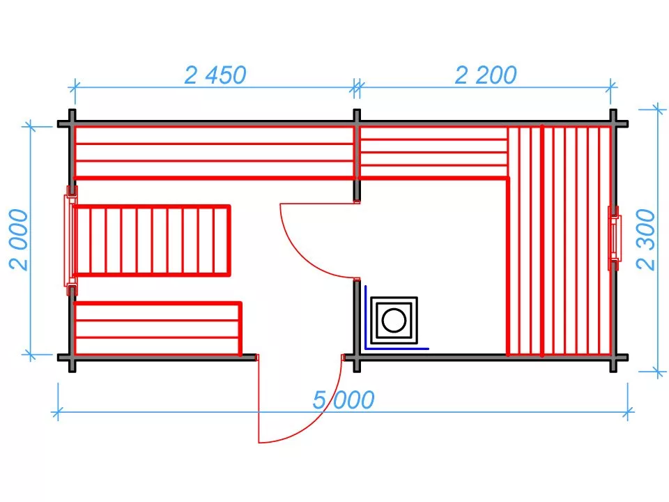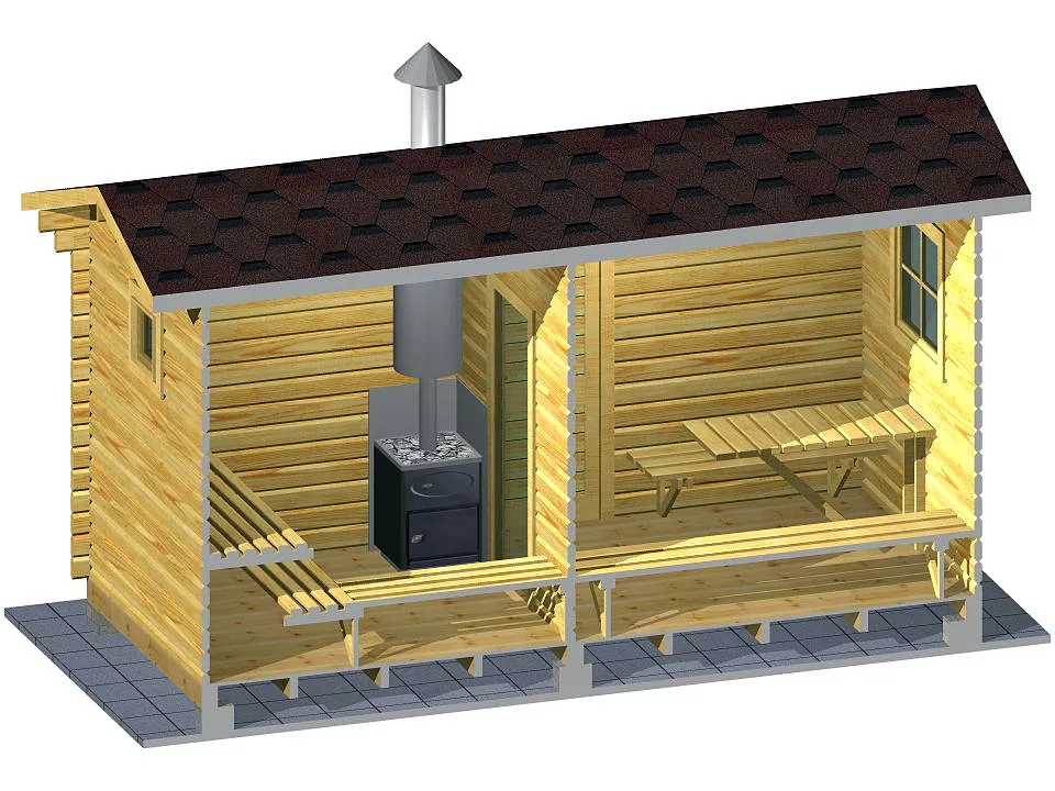 Площади парного отделения достаточно, чтобы максимально вместить 6 человек, или четверых с абсолютным комфортом. Такое же число людей может разместиться за столом в предбаннике, и в этом заключается основное отличие «Макси» от младших представителей семейства с комнатами отдыха скромных размеров.
