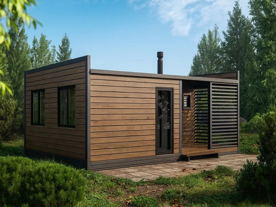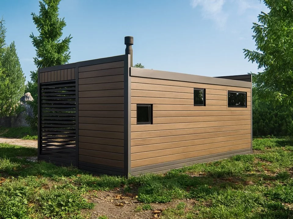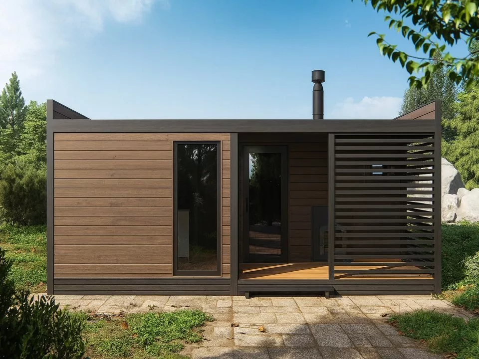 Современный финский стиль в дизайне делает баню настоящим украшением участка. Лаконичные формы, горизонтальная облицовка и натуральные цвета фасада подчёркивают эстетику минимализма и гармонично вписываются в природное окружение.