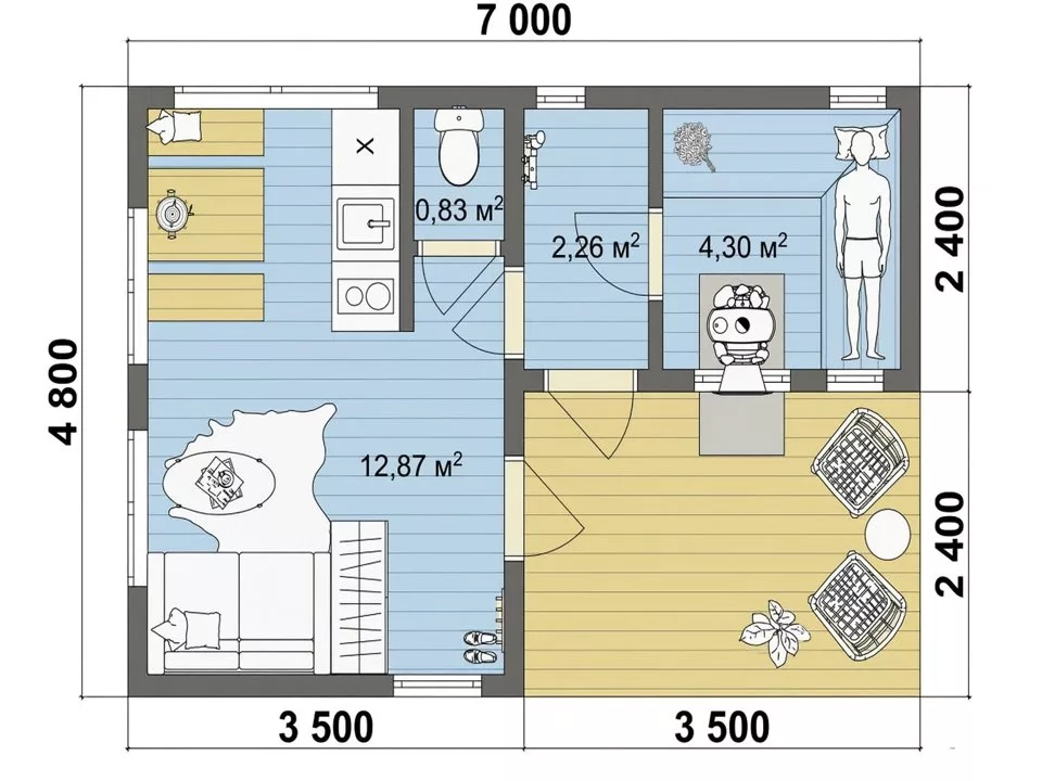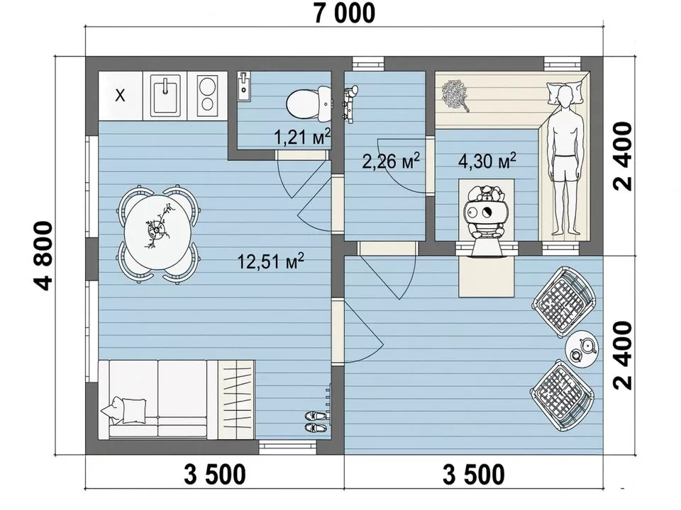 Особенность «Нордики» — просторная планировка. В ней удачно объединены традиционные зоны: парная, моечная, санузел и большая комната отдыха, а также открытая терраса для вечерних посиделок. Всё продумано для удобства семьи и гостей.
