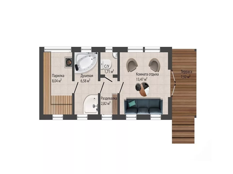 Каркасная баня Сольмера создана для тех, кто ценит комфорт, современный стиль и рациональные решения. Лёгкая конструкция обеспечивает надёжность и долговечность, а использование качественных материалов гарантирует тепло даже в самые холодные зимние дни. Внутреннее пространство продумано так, чтобы каждая деталь работала на атмосферу спокойствия и восстановления сил.