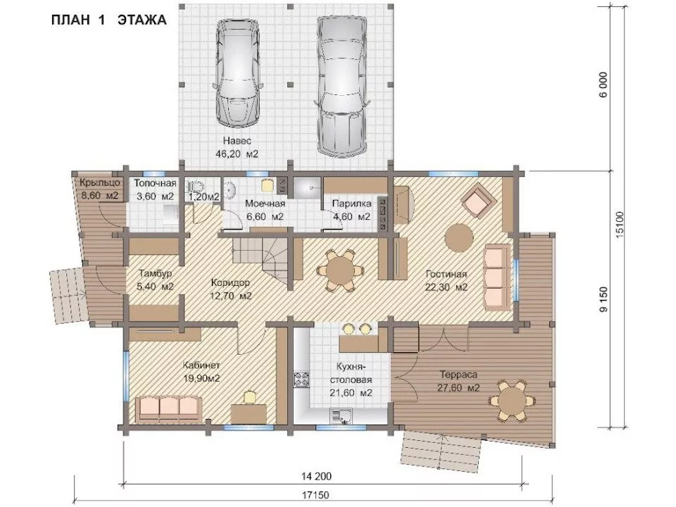 Конструкция стены по технологии "двойной" брус с заполнением пространства высокоэффективным теплоизоляционным материалом "Эковата" толщиной 150 мм. Брус камерной сушки из хвойных пород дерева влажностью 10-12% монтируется по технологии четырехстороннего замкового паза с ветровым замком (теплый не продуваемый угол)